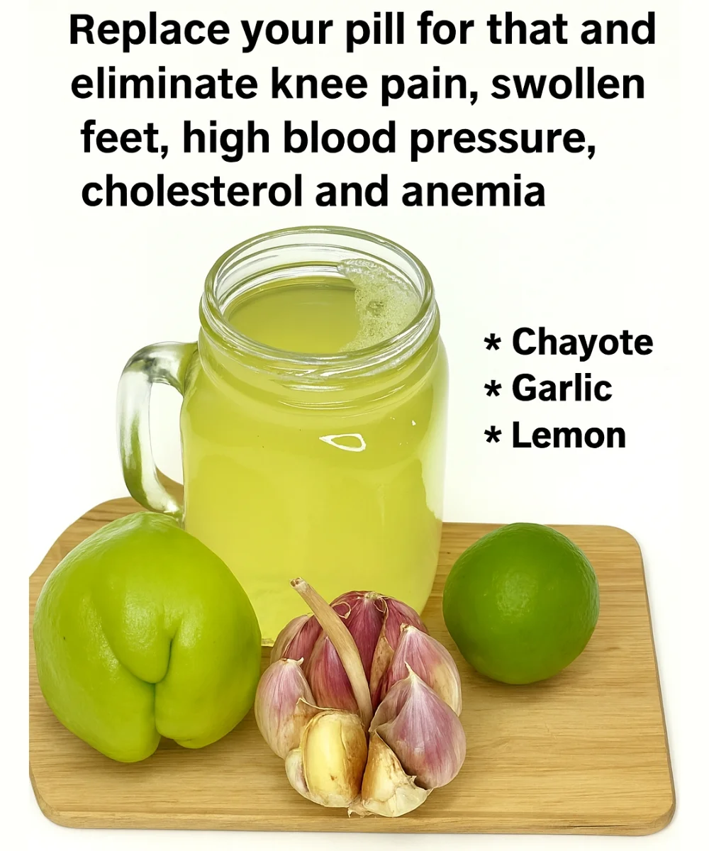 Pain & Swollen Feet Chayote + Lemon Chayote acts as a natural diuretic rich in potassium, helping the body eliminate excess sodium and water — reducing puffiness and swelling. Lemon adds anti-inflammatory and cleansing effects.
