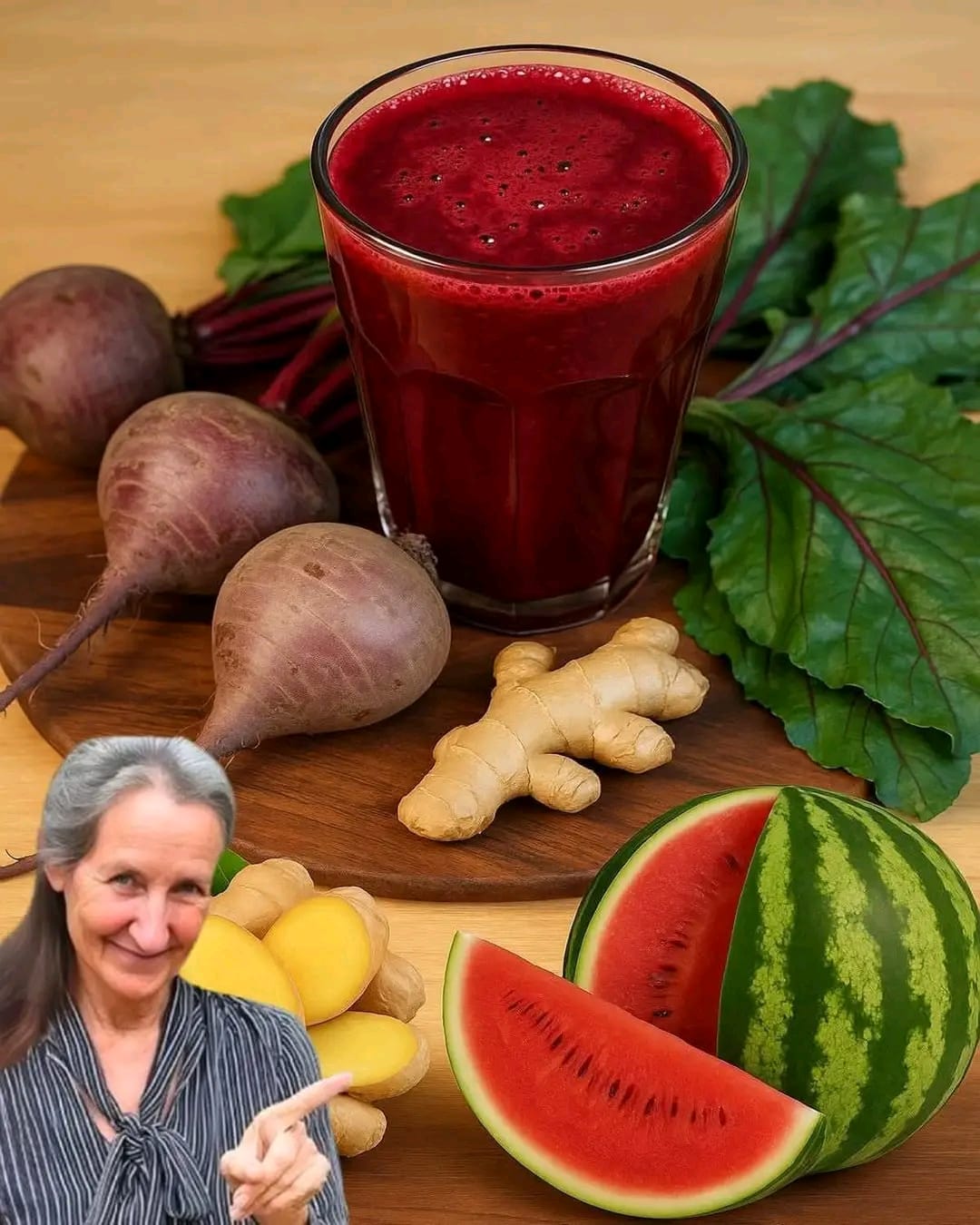 DescriptionThis vibrant juice is a refreshing and nutrient-packed drink combining the natural sweetness of watermelon with the earthy richness of beets, the zing of fresh ginger, and the anti-inflammatory power of turmeric. Perfect for a summer detox, post-workout hydration, or as a daily immune booster, this juice balances flavor and health in every sip. Ingredients For Beet, Ginger, Turmeric & Watermelon Juice2 cups fresh watermelon, cubed and deseeded1 medium beetroot, peeled and chopped1-inch fresh ginger root, peeled1-inch fresh turmeric root (or ½ tsp ground turmeric)½ lemon, juiced (optional, for extra freshness)1 cup cold water (adjust for consistency)Ice cubes (optional)InstructionsWash and prepare all ingredients.Add watermelon, beet, ginger, turmeric, lemon juice, and water into a blender or juicer.Blend until smooth. If using a juicer, process everything directly.Strain through a fine mesh sieve or cheesecloth if you prefer a smoother juice.Pour into a glass over ice cubes and serve immediately.NotesFresh turmeric is best, but powdered works if unavailable.For a sweeter taste, add a small apple or a teaspoon of honey.Juice is best consumed