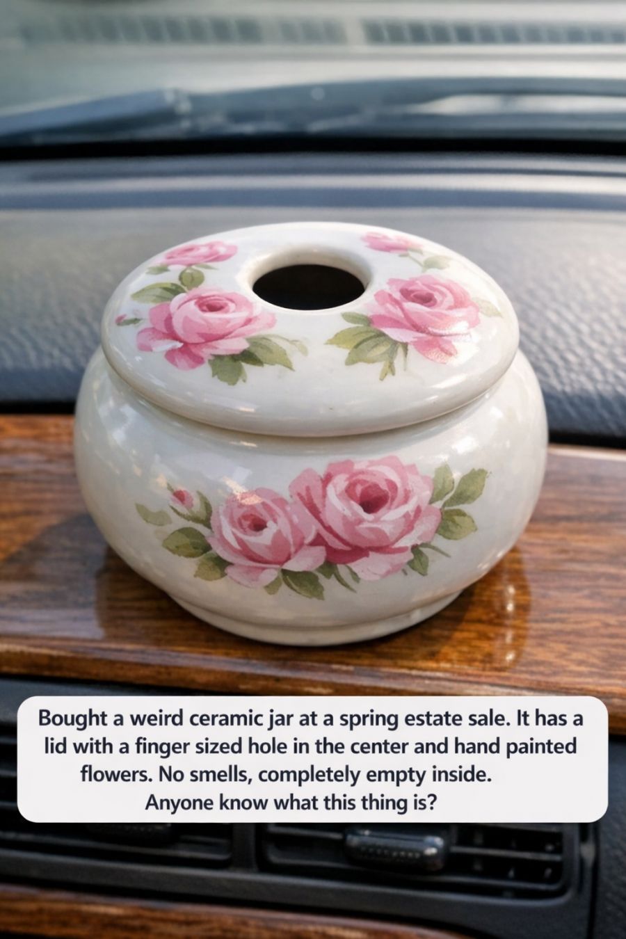 The ceramic jar stands approximately 5 inches tall and 4 inches in diameter. Its smooth, glossy surface is decorated with delicate hand-painted florals that suggest it was crafted with care and skill. The flowers, painted in soft hues of pink and blue, add a touch of elegance and beauty to the jar’s overall appearance. The most perplexing feature, however, is the lid. It fits snugly on top of the jar and has a perfectly round hole in its center, about the size of an average human finger.