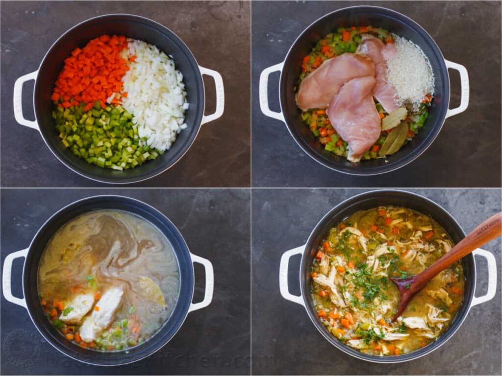 Add chicken, rice, bay leaves, chicken broth, water, salt, and pepper. Bring it to a boil, skimming off any foam that rises to the top. Reduce heat to medium-low and cook uncovered at a light boil for 25-30 minutes, or until rice is tender and chicken is cooked through.*