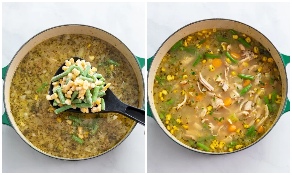 Add the frozen vegetables. Cover partially and simmer for 10-15 more minutes. Serve!