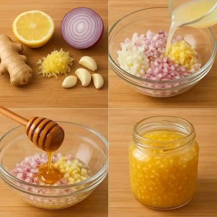 Ingredients:2 tablespoons of honey1 tablespoon of freshly squeezed lemon juice1 small onion (juiced or finely grated)2 cloves of garlic (minced or crushed)1 teaspoon of grated gingerInstructions:Thoroughly mix all ingredients in a clean bowl.Store the mixture in an airtight container in the fridge for up to a week.Consume one teaspoon 2-3 times a day, particularly during cold and flu season.The blend of honey, lemon juice, onion, garlic, and grated ginger offers a simple yet potent means to enhance your health naturally. By incorporating these elements into your daily regimen, you can bolster your immune system, aid digestion, and combat common ailments. Prior to trying new remedies, especially if you have allergies or medical conditions, consulting a healthcare professional is crucial. Embrace the wonders of nature and allow these timeless ingredients to nurture your well-being!