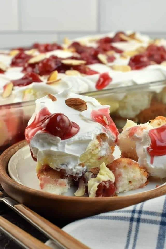 Heaven on Earth Cake with delicious layers of angel cake, sour cream pudding, cherry pie filling, whipped topping, and almonds. Creamy and decadent, this cherry trifle is a sure crowd pleaser!To Make this Recipe You’ Will Need the following ingredients: