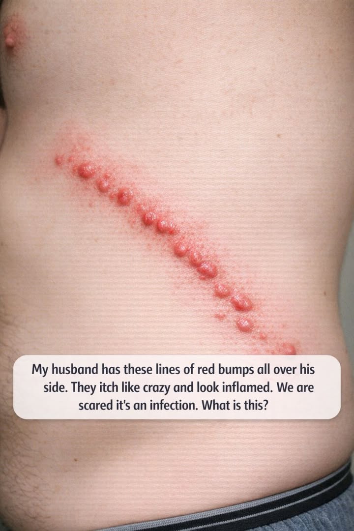 My husband has these lines of red bumps all over his side. They itch like crazy and look inflamed. We are scared it’s an infection. What is this?