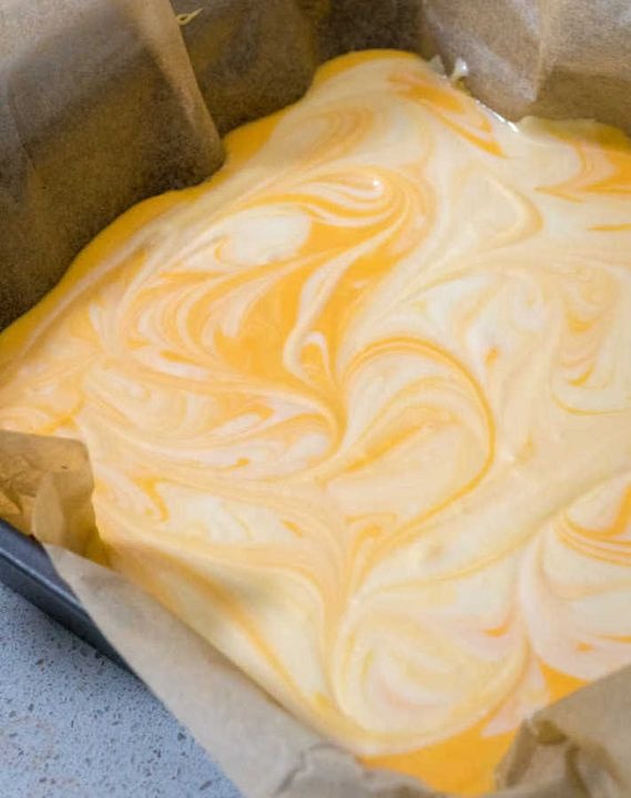 Those four ingredients are a can of vanilla frosting, some white chocolate chips, some orange food coloring, and some orange extract. See, you’re really just making one batch of fudge, and then changing the flavor and color of portions of it before swirling it all back together.