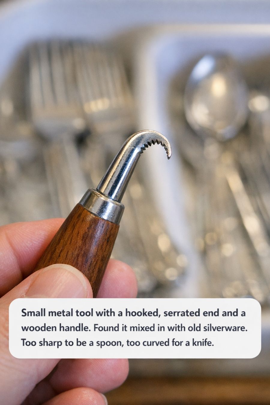 In the world of vintage kitchenware, one can stumble upon many intriguing and mysterious tools, each with its own unique history and purpose. Among these curiosities, you may find a small metal tool with a hooked, serrated end and a wooden handle, nestled among old silverware. At first glance, its function may not be immediately apparent, as it doesn’t conform to the typical shapes and edges of common utensils like spoons, forks, or knives.