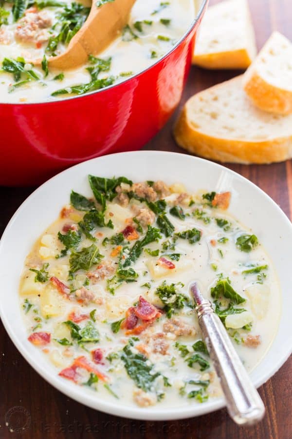 When potatoes nearly done, add chopped kale and cooked sausage and bring everything to a light boil.